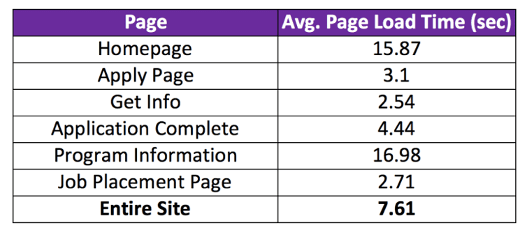 The next metric we’ll focus on is site speed. Studies have found a direct correlation between slower site speed leading to fewer conversions. When we use site speed through Analytics, we can measure by site overall or break it down by specific pages. By breaking it down page by page, we can pinpoint what could be causing the site’s speed metrics to be reduced and focus solely on that page. Below is a breakdown of site speed across multiple pages: