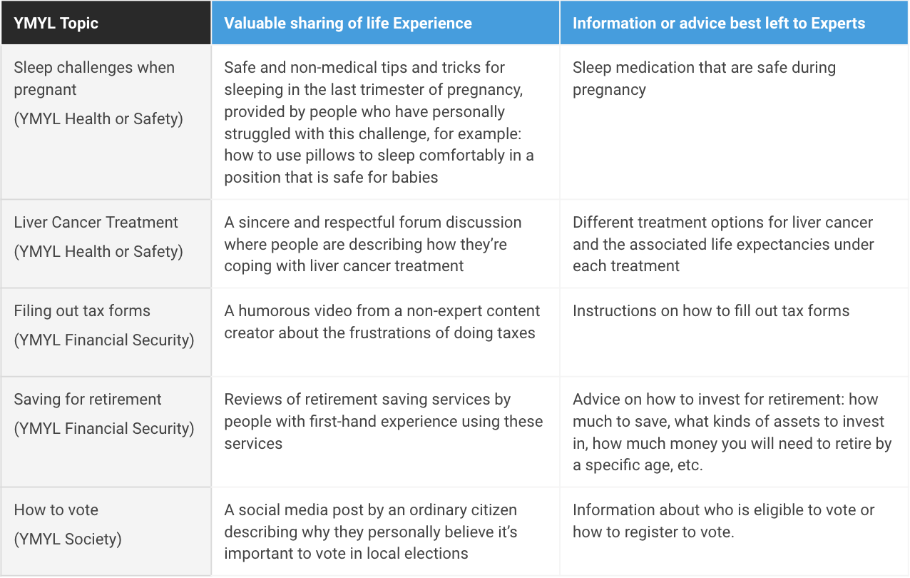 In regards to YMYL, there may be instances where content is entirely left to experts in the field rather than folks with experience. Google provides this helpful example in the search rater guidelines (page 28).
