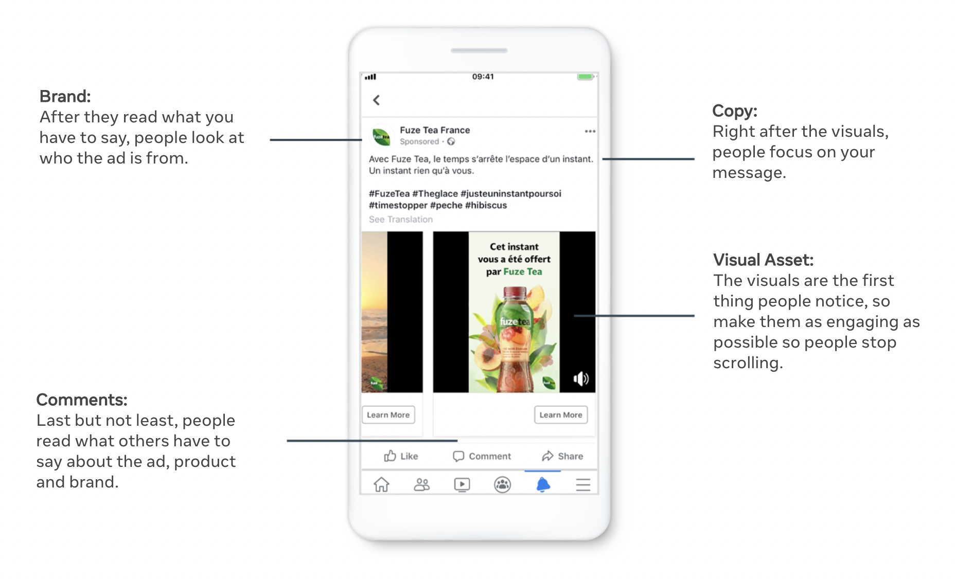 On Facebook, the ad copy refers to the text displayed as part of the advertisement (e.g. the Primary Text, Headline and Description). After the displayed creative (e.g. the image or video), people focus on the message.