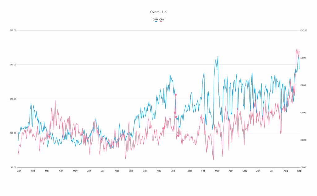 Analyzing Brainlabs clients’ performance over the past few years, we found that on average CPMs increased up to 93% in the US on Black Friday and up to 80% in the UK in the days leading up to Christmas.