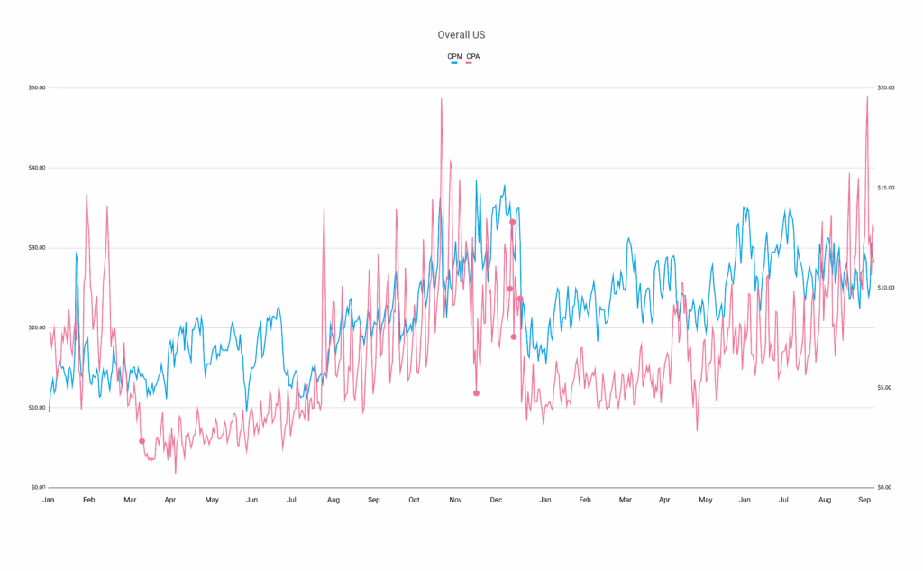 Overall, we see a drop in CPAs on Black Friday as people are motivated to shop, while CPMs sharply increase and remain high throughout the December Peak (December 1st – 31st).