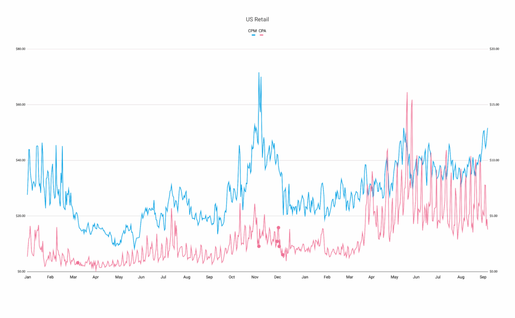 In the retail sector, CPMs are at their absolute highest on Black Friday and slowly work their way down throughout December. CPAs followed a similar trend.