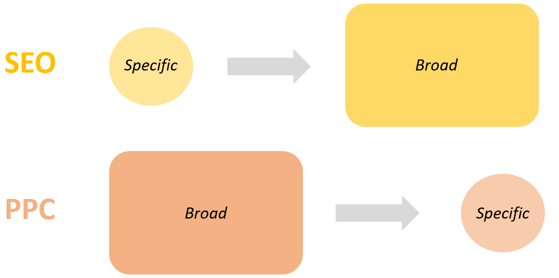 - As the two approaches are different (SEO: narrow to broad vs PPC: broad to narrow), chances are that combining the data will provide keywords that a siloed approach would have not brought to the table.