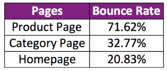 This is just one way to break down bounce rate metrics. We can take away a few key learnings from this data. The product page is an important page on an ecommerce site. The product page is the visitor’s step before adding their specific product to the cart and potentially purchasing. We want to provide enough information for the visitor so they’re able to proceed without leaving.