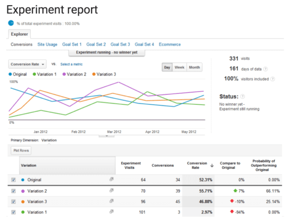 The last Google Analytics tool we’ll be looking at is Google Content Experiments. This tool gives us the option to set up split URL page testing within the Analytics interface. Once we set up our basic parameters, we’re able to view reports like below to analyze performance of the split test.