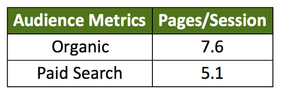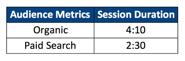In the example above, we’re able to look at session duration by the type of audience visiting the site. In this example, for our paid search clients, we want to increase the session duration and meet their expectations after visiting the site.