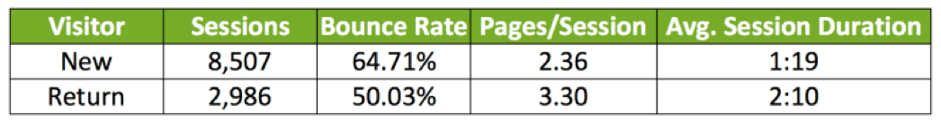 The next metric we’ll look into is analyzing our audience types. Breaking the audience down by new vs. returning visitors, we’re able to take a closer look into how audience types impact performance. Below is an example of how we can break down our metrics.