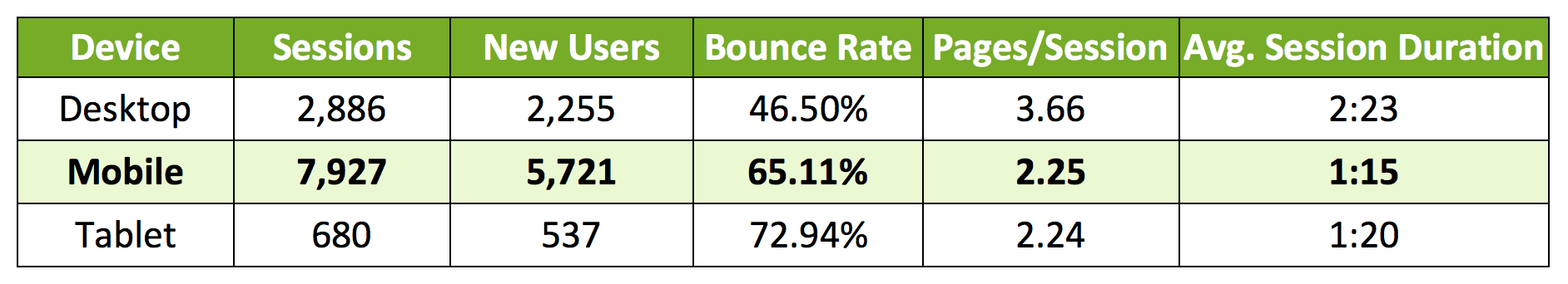 From this data, we can make a few assumptions in our efforts to improve performance. Because a lot of the sessions above are new visitors, we want to optimize performance for this particular audience. Are we not providing enough information on the page in that their bounce rate is higher and their session duration is lower?