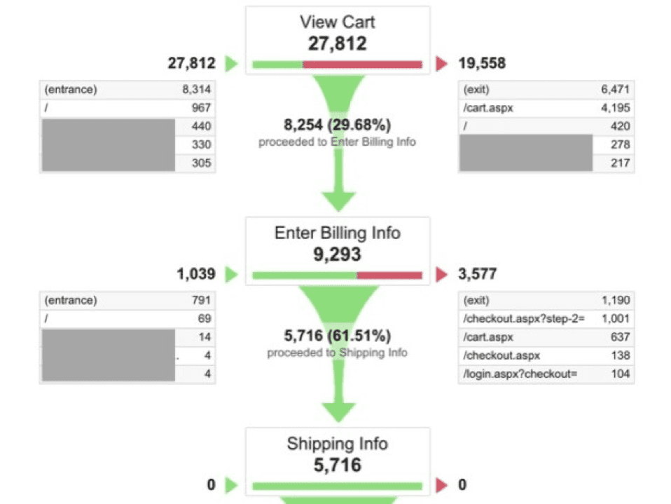 As we can see, it breaks down that we have a significant number of people dropping off after they reach the cart page. Maybe there’s an area for optimization to reduce that drop-off amount.