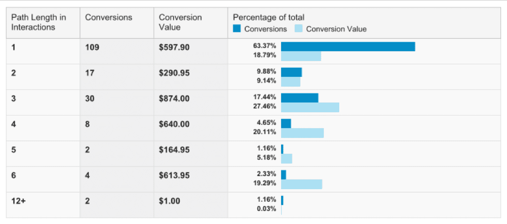 Under Multi-Channel Funnels, we can use the Path Length tool to measure how users are interacting with our site and how long it’s taking them to convert. Looking at the chart below, we can use path length alongside our remarketing strategy to grab users after they visit.