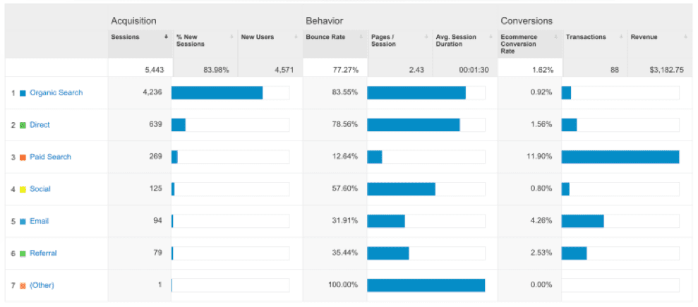 Another tool we can use is the Acquisition Overview section of Analytics. This information could further tell us what types of visitors are converting at a higher rate as well as what other types of visitors aren’t converting at such a rate.