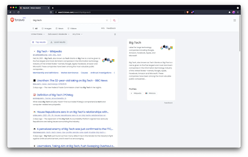 - A transparent Search Results Independence metric which displays the percent of results sourced from other public APIs (like Google and Bing) for the specific search, for a browser’s lifetime searches, and anonymously for all searches to date by every user on Brave. This is framed as a way to balance user experience while still providing information about the level of independence from “big tech” Brave is currently delivering.
