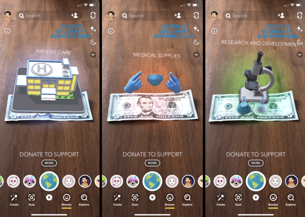 In April, Snapchat made it easier for users to donate to COVID-19 relief efforts with the launch of a new AR donation experience, and a Swipe Up to Donate option on content covering COVID-19 within the Discover section of the app.