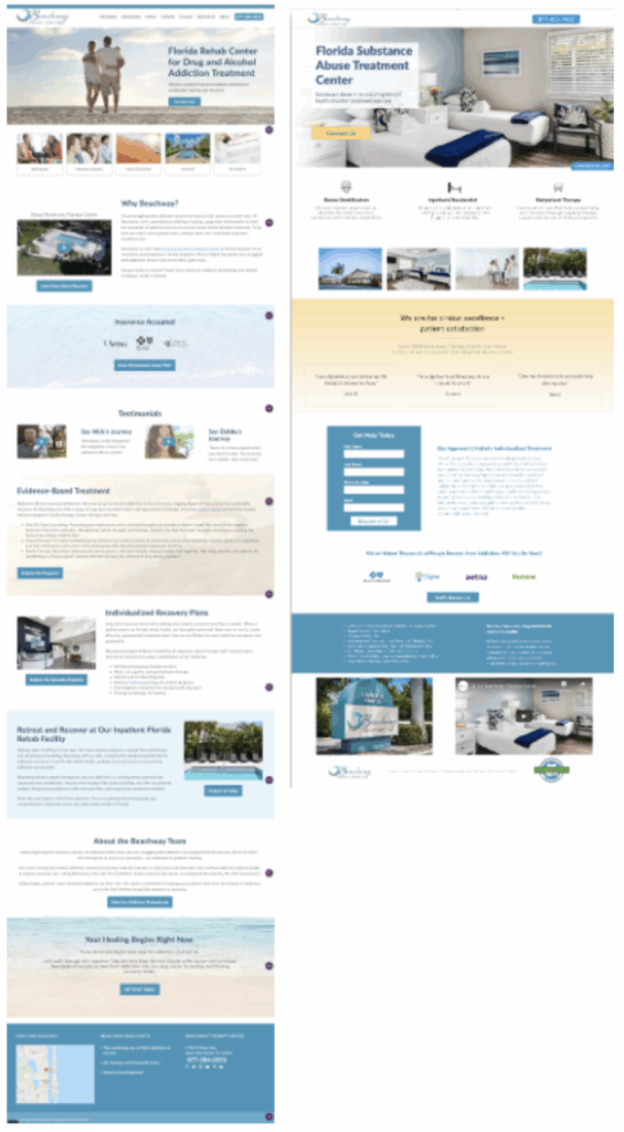 The page on the left is the homepage of a rehabilitation site. We sent traffic to this page through paid ads for years, attempting to optimize the site and the conversion actions to get inquiries and fill beds. We knew, through our research, that there was far too much information available even just on the home page alone, not to mention the entire site.