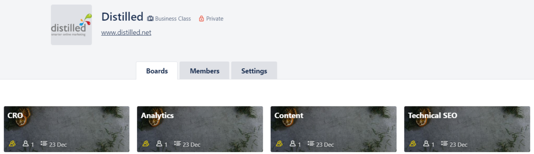 I like to use boards for different work areas – this could look like the below, where I separate my technical SEO projects from content, analytics or CRO tasks.