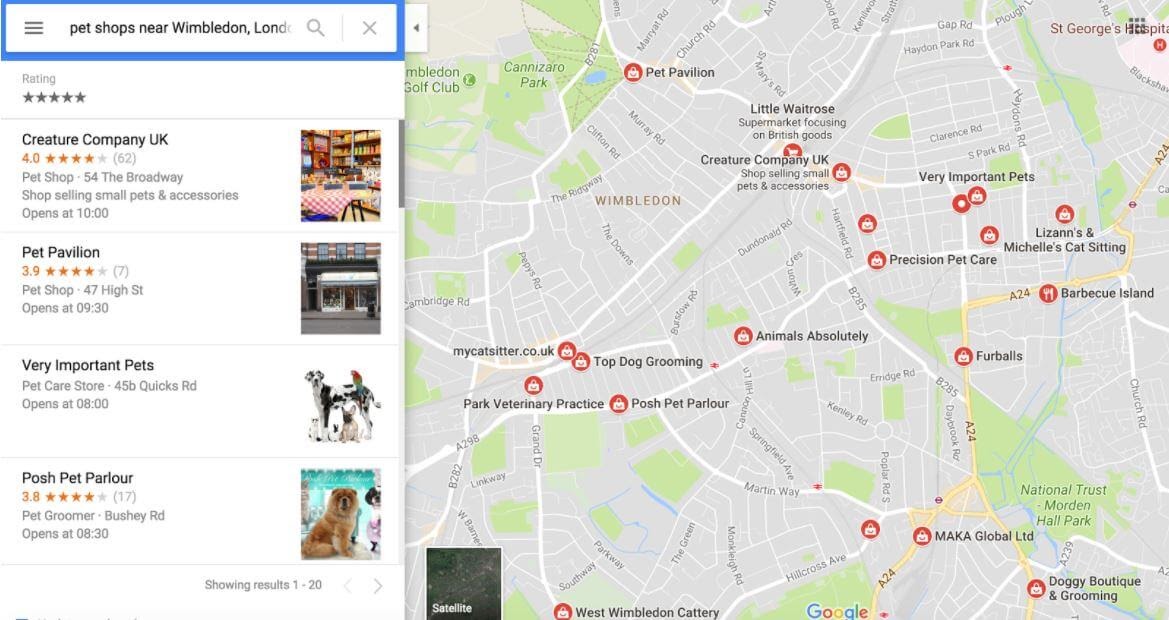 In the example above, we search for “pet shops near Wimbledon” and Google shows similar businesses on the map as well as listings on the left side. If, for instance, due to proximity you want to include also New Malden as an area to find competitors, you can zoom out the map to expand your results across Wimbledon and New Malden. Otherwise, if you want to look into a more specific area of Wimbledon, you can zoom in the map to shrink your competitors’ results.