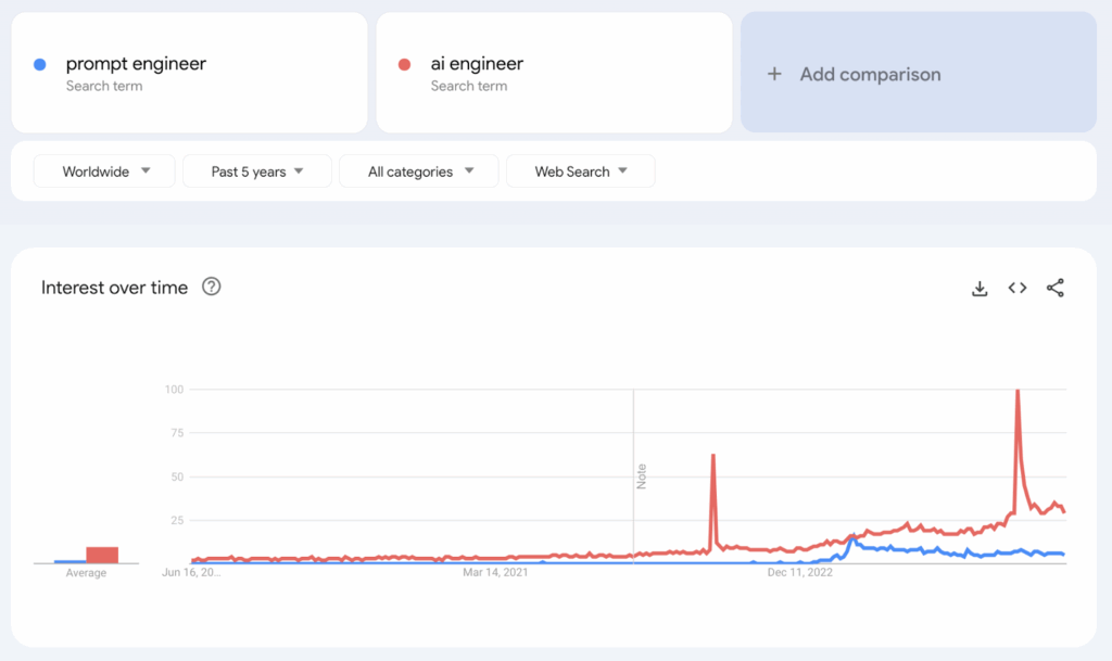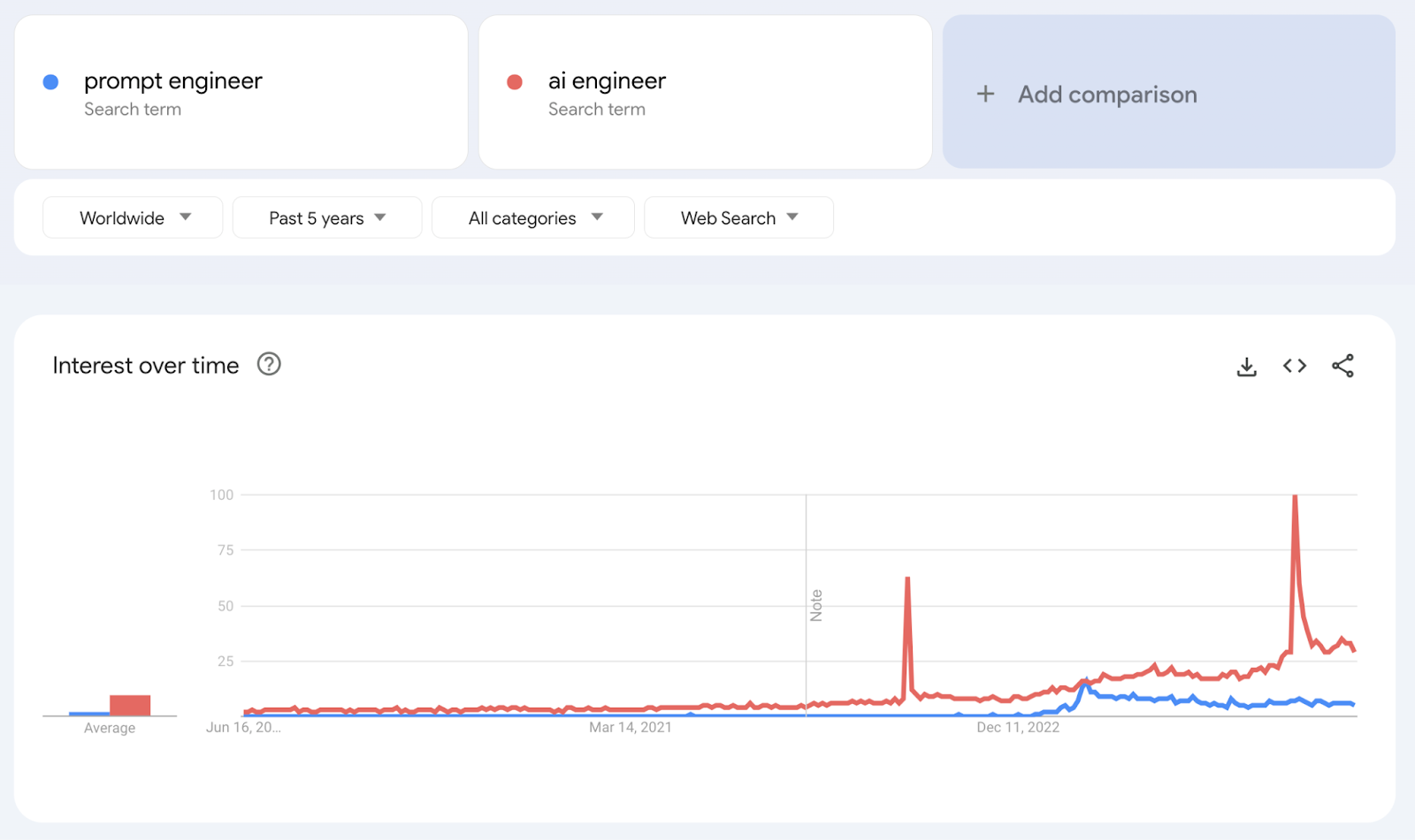 Already I am seeing the term ‘prompt engineer’ level out after an initial spike, as the momentum carries itself into a broader ‘AI engineer’ role, which includes fine-tuning custom models, implementing logging and evaluation metrics, and building the infrastructure needed to provide LLMs with the right context.